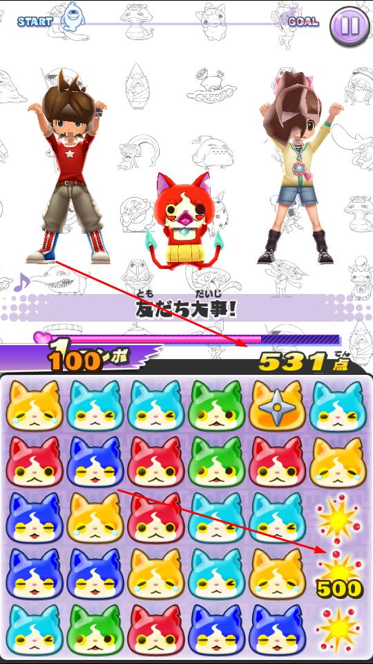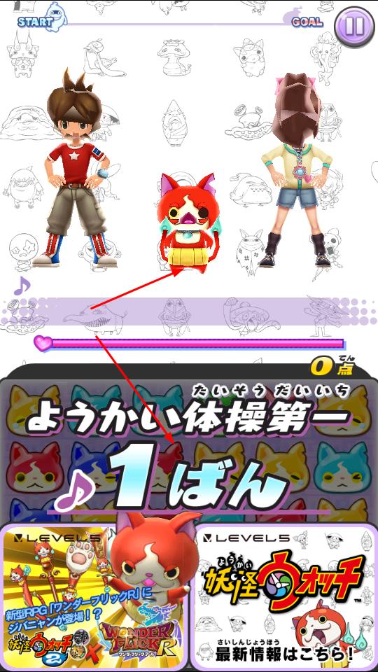 2、角色将伴随音乐做体操动作,同时操作下方拼图区域,滑动连接相同颜色的妖怪头像进行消除,积累分数。