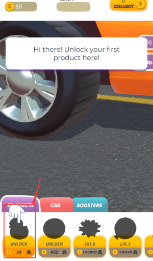 2、点击红框UNLOCK按钮,花费30金币解锁第一个产品。