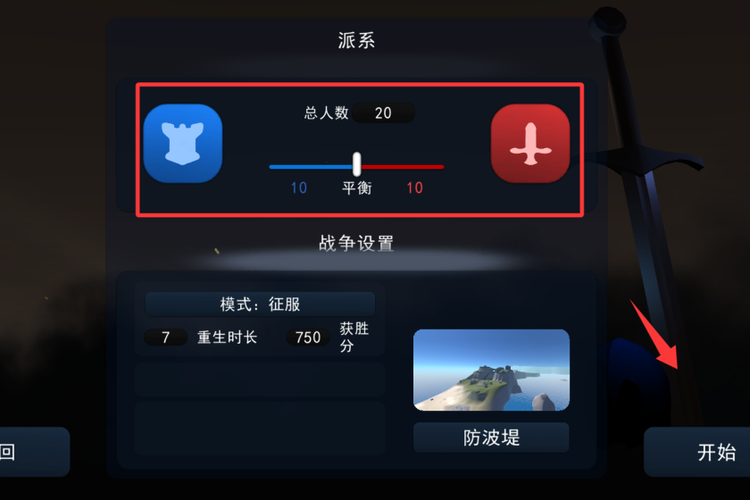 3、选择派系和对方的人数还有模式,选好了点击开始。