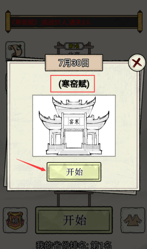 4、点击红框开始按钮,挑战寒窑赋文学知识关卡。
