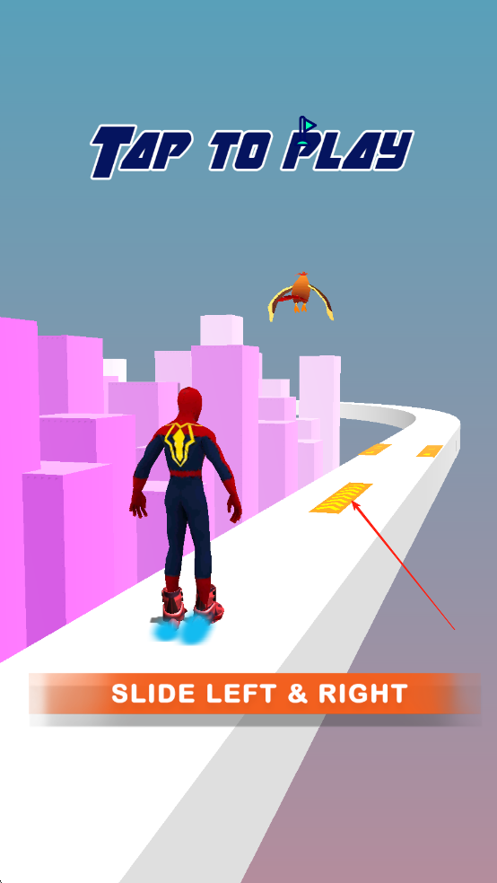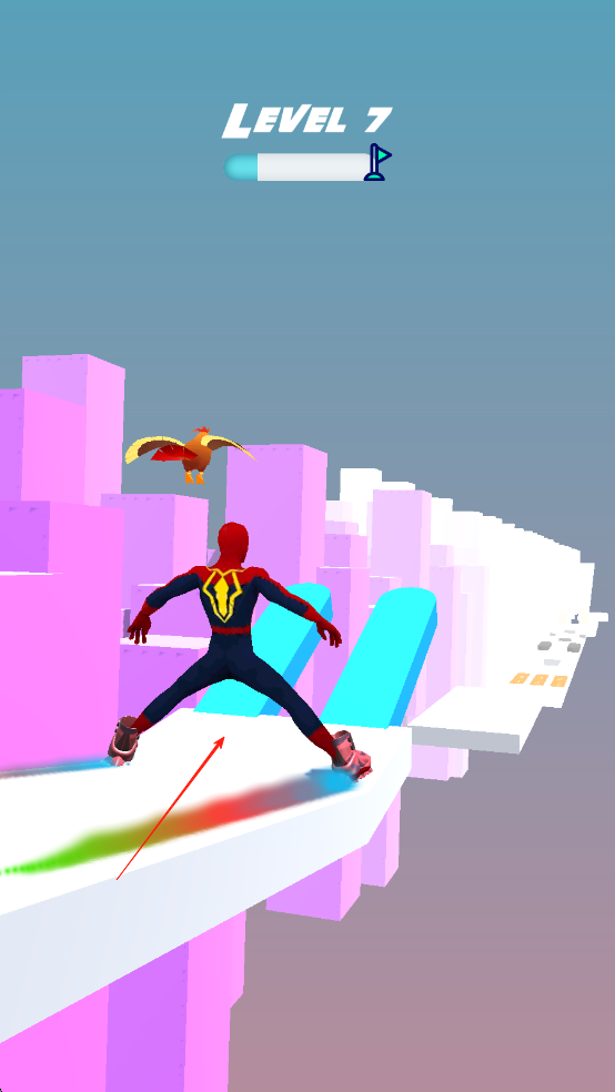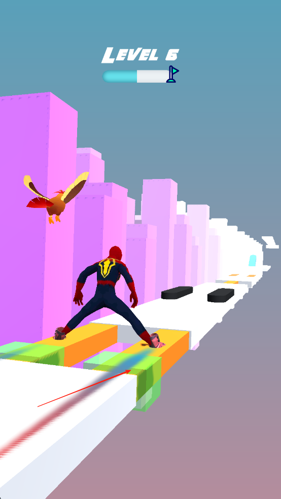 1、角色会自动移动骂我需要做的就是移动角色双腿开合,避开前方障碍,前方出现的加速条踩上后会加速一段时间。