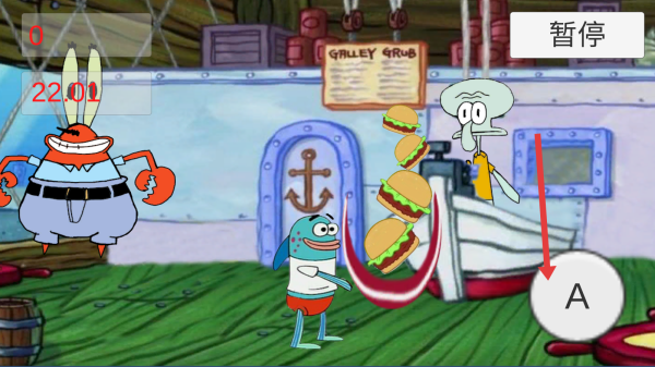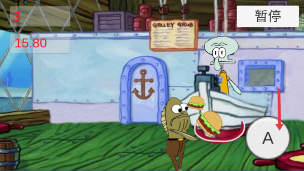 2、注意左上角数字倒计时以及分数,遇到大小不一的瓜皮出现,点击A键放汉堡速度也要不一样。