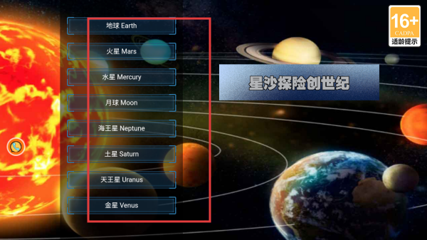 1、这是一款名为星沙探险创世纪的游戏,在初始界面,有多个星球可供选择你感兴趣的星球,开始你的星际探险之旅。