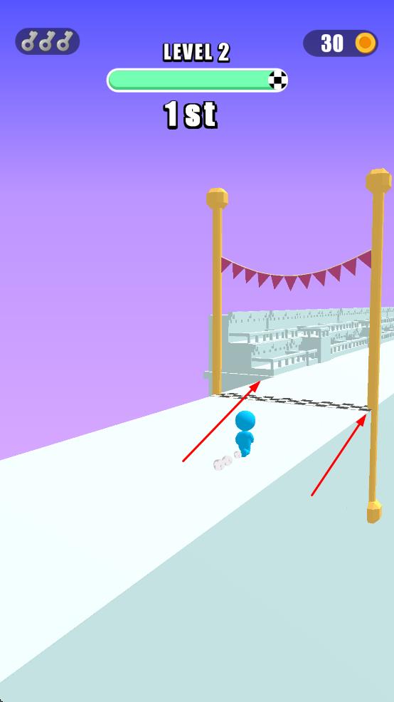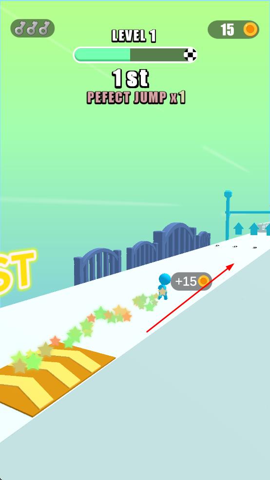 1、操控蓝色小人在跑道移动,借助黄色加速带起跳,收集沿途金币,触发评价,提升排名至1st,同步推进上方进度条。