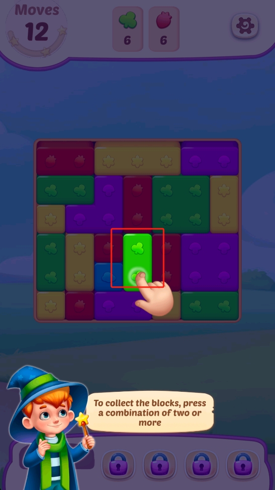 1、跟随教程指引点击图中的绿色三叶草方块,连接相邻同色方块触发消除,逐步完成6个三叶草与6个石榴的收集目标。