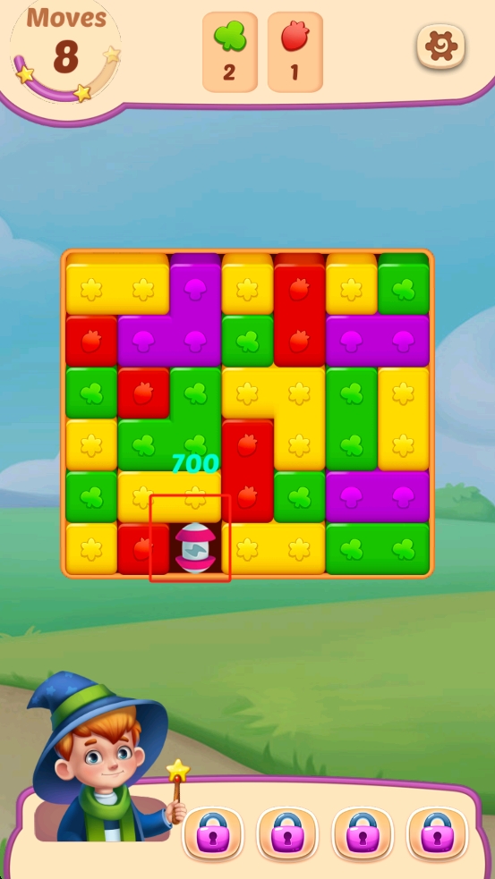 2、优先消除红色框选彩蛋周围的同色方块,触发彩蛋道具效果,快速清理棋盘,推进三叶草与石榴的收集进度。