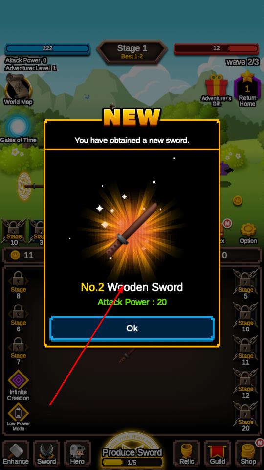 2、推进Stage1等关卡后,触发新武器获取弹窗如No.2 Wooden Sword,Attack Power:20,点击Ok确认,解锁武器并积累战力。