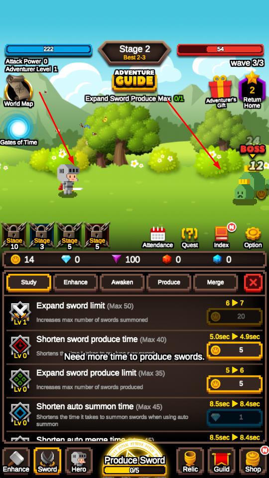 3、进入Stage2关卡,操控角色对抗小怪与BOSS,通过下方Study界面,升级武器上限、生产时间等养成项如Expand sword limit,强化能力以攻克更高阶段。