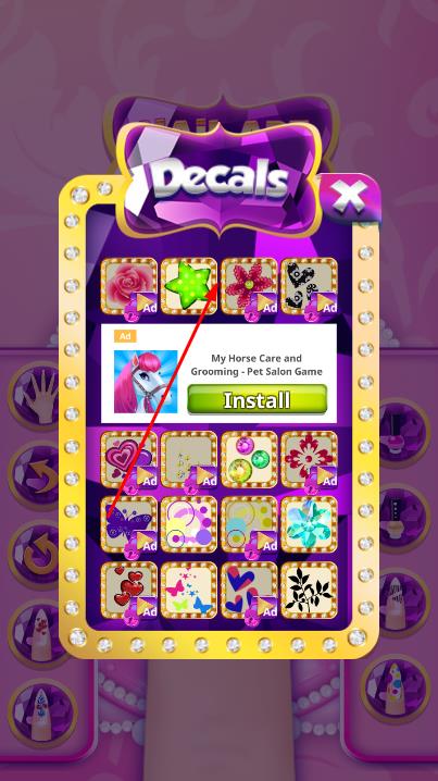 2、完成指甲涂色后,进入装饰图案选择界面,界面中会显示多种装饰图案,选择喜欢的装饰图案,点击放置在涂好色的指甲上。