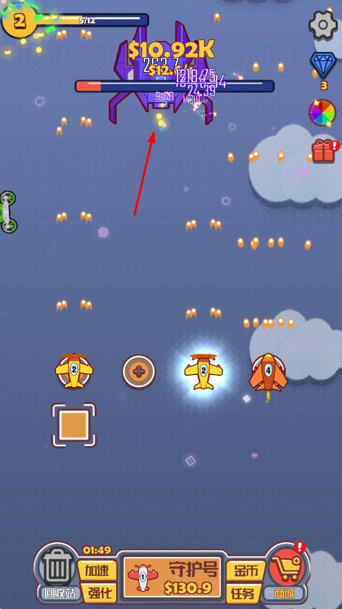 3、资源分配方法:金币优先用于升级核心战机等级,多余资源投入基地防御,确保在敌机波次密集时能稳定输出,减少战斗损失。