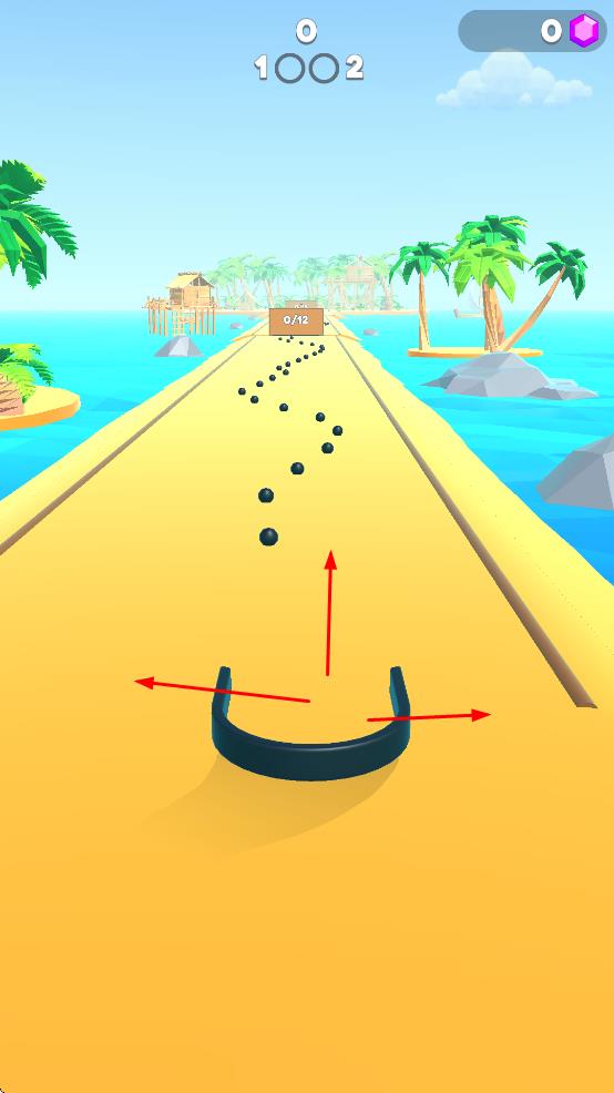 1、操控黑色U型收集器在热带海岛风格的黄色跑道上移动,通过左右调整位置、向前推进。
