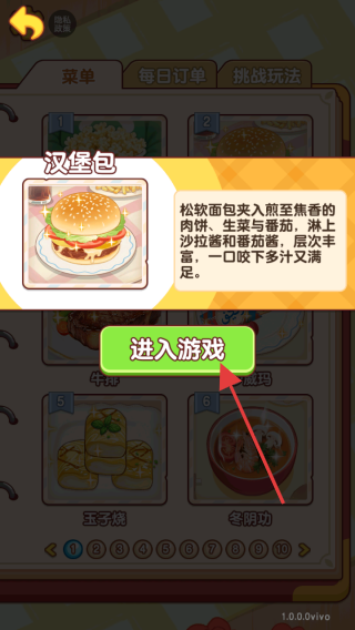 2、选择汉堡包后,查看其介绍,了解松软面包夹入煎至焦香的肉饼、生菜与番茄,淋上沙拉酱和番茄酱的制作特色,然后点击进入游戏开始制作。