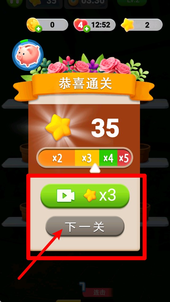 1.通关后系统会显示获得的星星数量和奖励倍数,可以观看视频领取额外奖励星星,或点击下一关继续挑战。