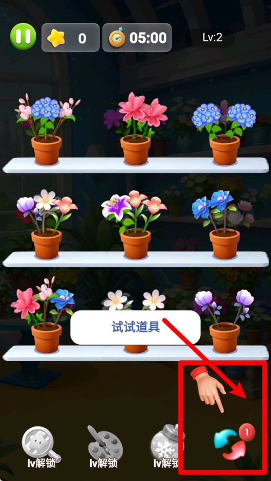 3.提示道具功能可帮助玩家在遇到卡关时自动交换花朵或提示可消除区域,快速找到最佳解决方案。