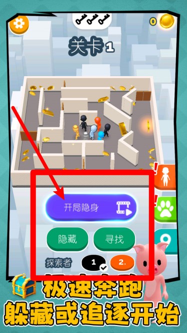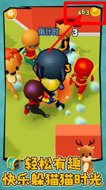 2.金币数量显示在屏幕右上角,收集更多金币可解锁丰富的皮肤和道具,体验轻松有趣的躲猫猫时光。