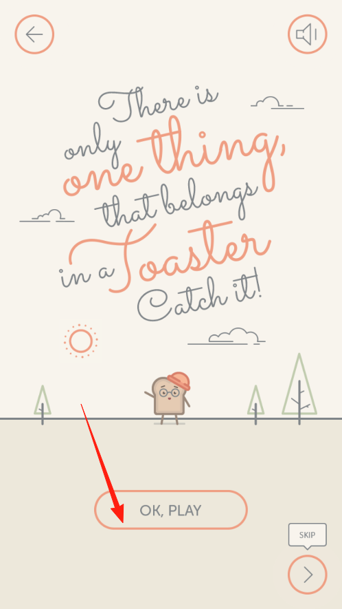 1、界面有可爱吐司人和文字提示,想玩就点OK PLAY,点了之后,就能进入游戏,开始尝试接住属于烤面包机的东西,开启趣味挑战。