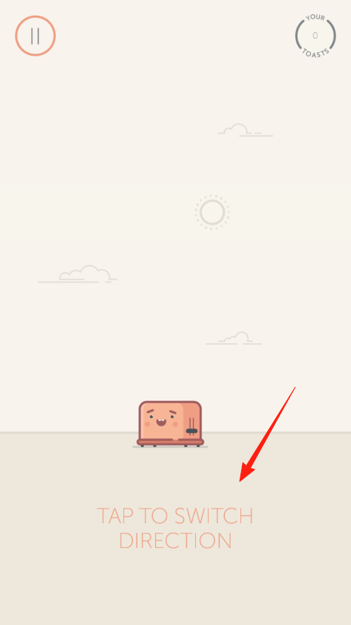 2、游戏里出现烤面包机角色,屏幕下方有TAP TO SWITCH DIRECTION提示,玩的时候点击屏幕切换烤面包机移动方向,让它避开障碍继续往前别让它停下。
