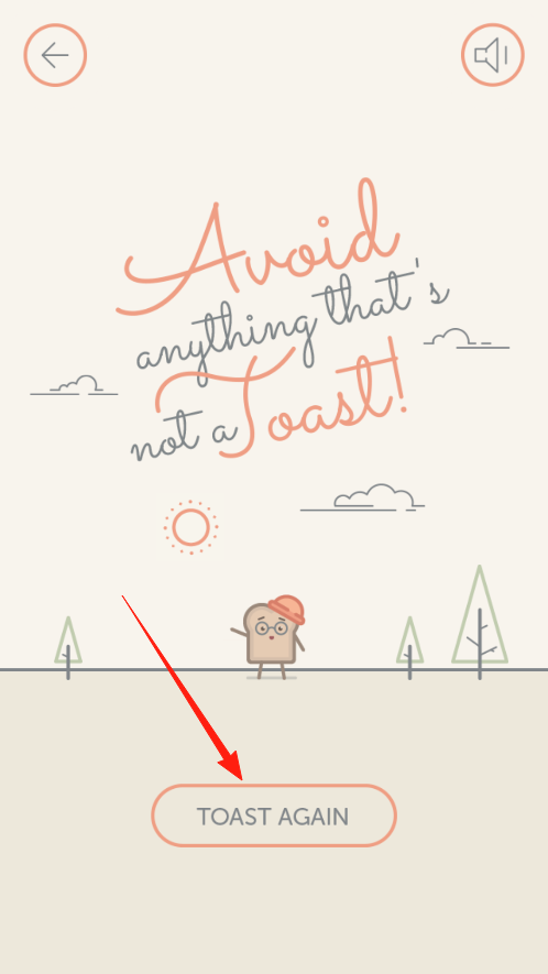 3、游戏结束后,看到TOAST AGAIN按钮,要是想再玩一轮就点这个按钮,重新开始挑战继续尝试避开非吐司的东西,争取更好表现。