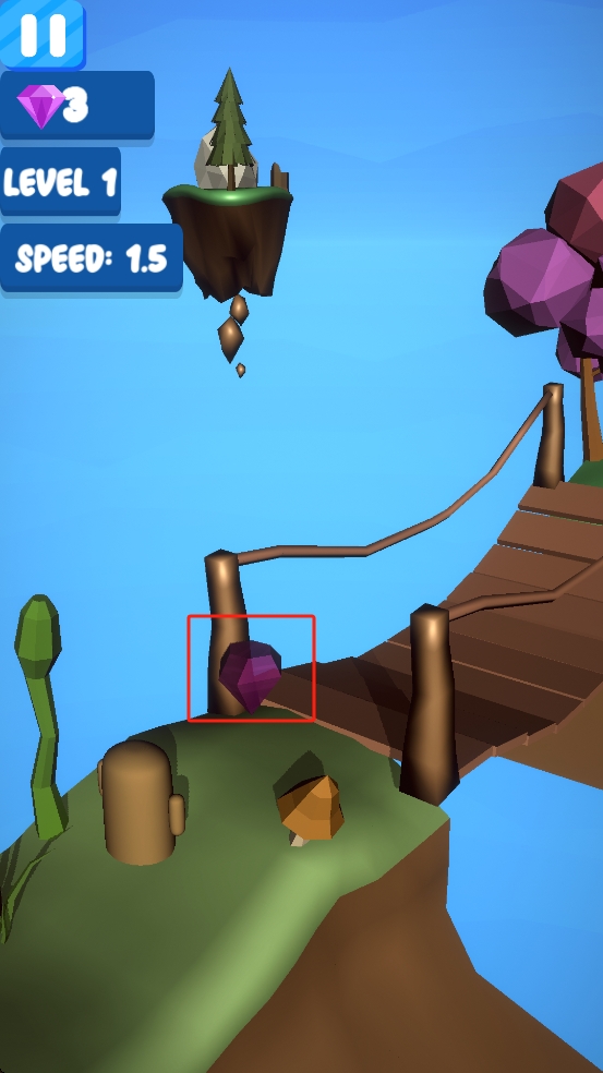 1、进入作品后操控角色靠近桥头的紫色钻石,完成收集,开启关卡资源获取的第一步,留意场景内的悬浮岛屿与植物分布。