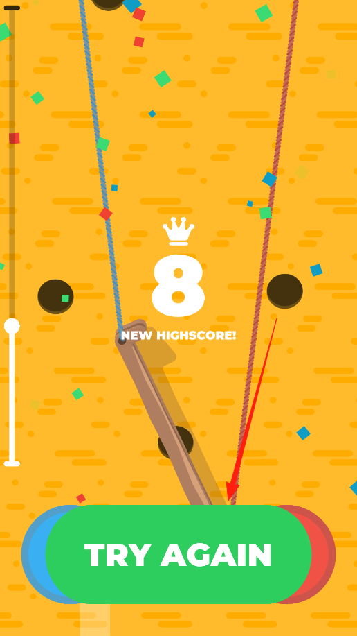 3、这是游戏结束界面,显示得分和TRY AGAIN按钮,要是小球掉下去游戏结束,想再玩就点绿色按钮重新开始,挑战更高分数看看这次能不能让小球坚持更久。