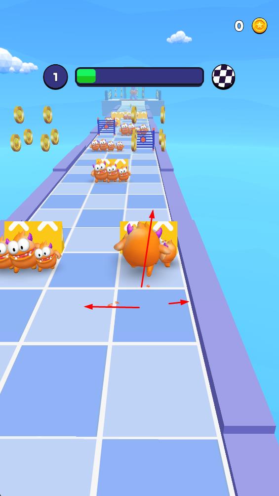 1、左右移动操控怪兽在跑道前进,收集金币并合并相同小怪兽,壮大队伍规模,为后续挑战蓄力。
