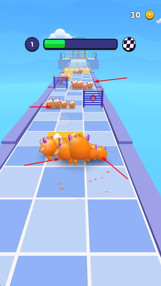 1、聚集人群壮大队伍:从初始角色出发,在奔跑中不断聚集散落的豆人,让队伍逐渐壮大,人数越多越能抵御风险,为对抗敌人和穿越障碍奠定基础,感受队伍成长的乐趣。