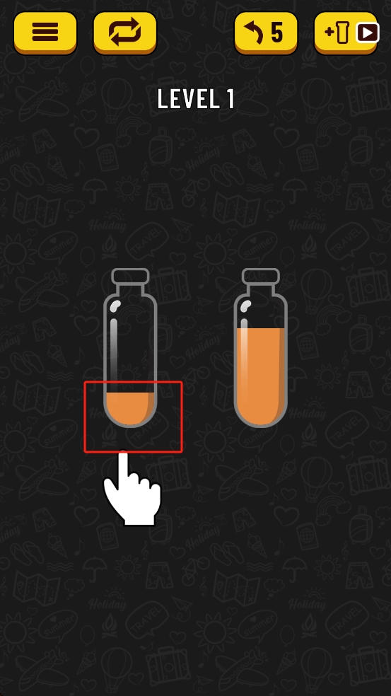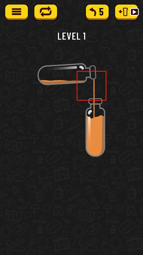 2、将左侧瓶子倾斜,使橙色液体缓缓倒入右侧玻璃瓶,直至右侧瓶子被同色液体装满,达成液体分类的关卡目标。