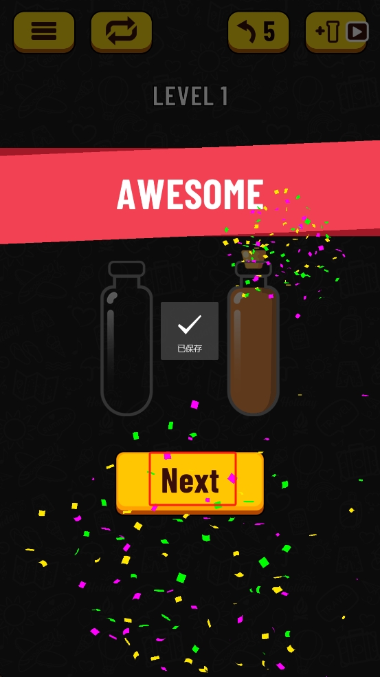 3、关卡完成后,界面弹出AWESOME提示与彩色纸屑,点击下方的Next按钮,继续挑战后续的液体分类关卡。