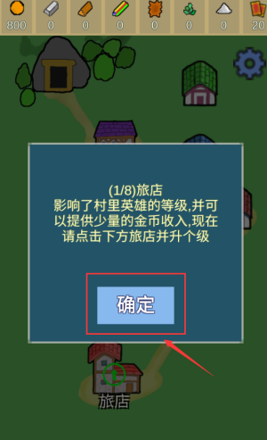 3、点击红框确定按钮,按照指引升级旅店建筑。