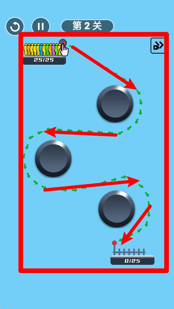1.绘制路径指引:玩家需要从人群起点拖动安全绳线,精心绕过障碍,引导所有人安全到达终点区域。