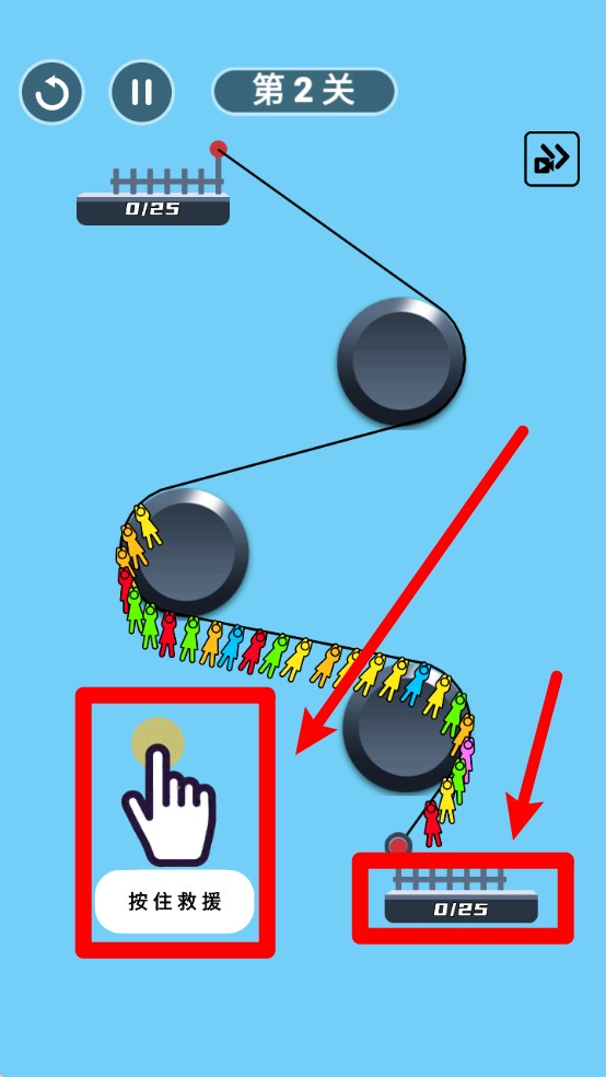 2.放置救援绳索:点击画面设定绳索路径,人物会自动沿绳子滑行,考验你的路径设计能力和反应速度。