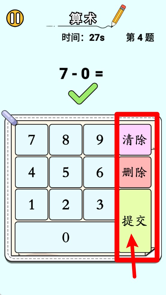 2.作答功能区域:右侧按钮包含“清除”、“删除”及“提交”,分别用于清空、删除数字和提交答案。