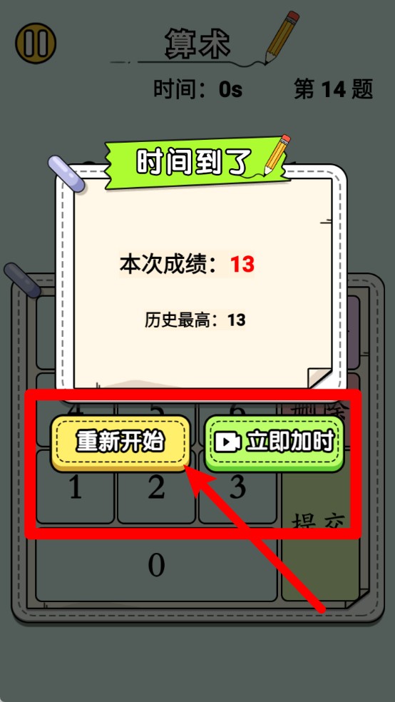 3.游戏结束界面:答题时间结束后会显示成绩,可选择“重新开始”按钮继续挑战更高分数。