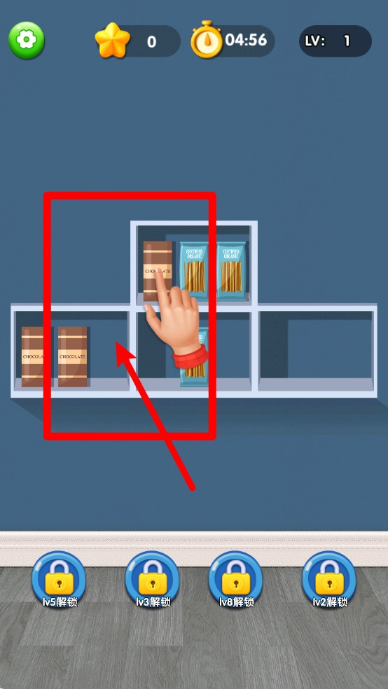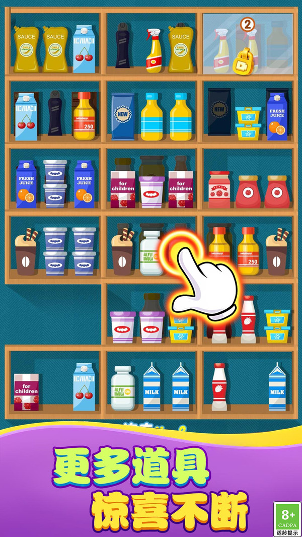 1.完成三消操作:通过点击三个相同物品进行消除,清理货架上的所有杂乱物品,达到整洁目标即可通关。