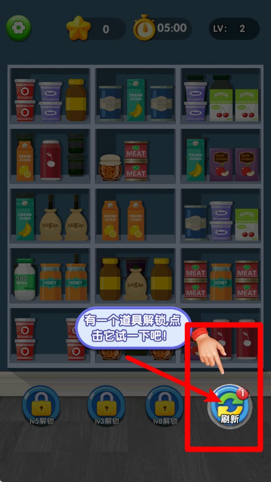 2.使用刷新道具:当没有可消除组合时可点击右下角刷新按钮,系统将重新排列物品,增加过关机会。