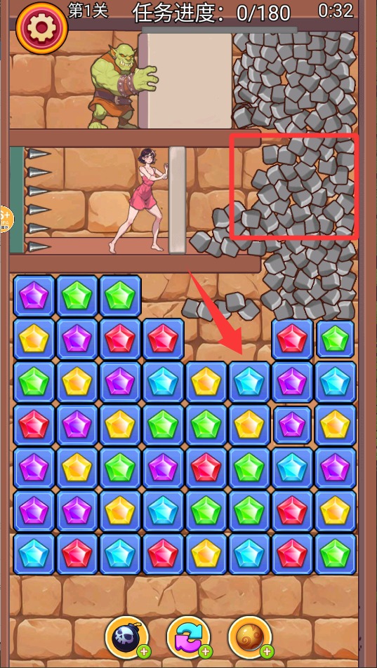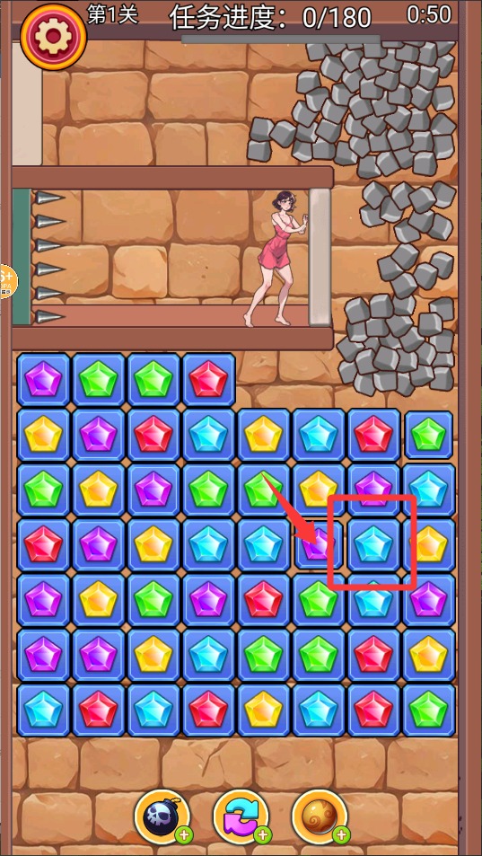 1、基础消除操作。通过滑动连接三个或以上相同元素,优先消除特殊障碍物。注意五边形元素的旋转特性消除角度。