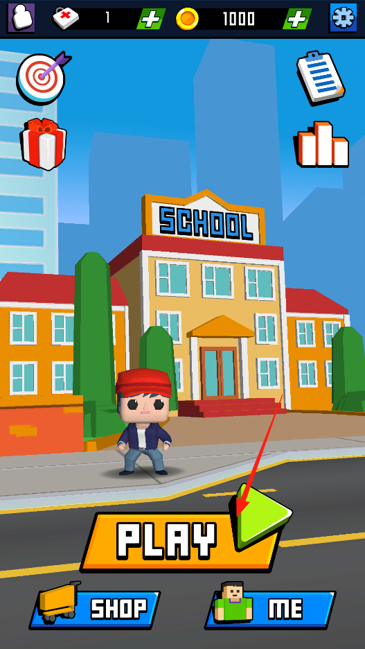 2、在主界面角色站在学校前,点PLAY按钮进入游戏关卡,操控角色开始跑酷或者完成校园任务,体验游戏核心玩法。