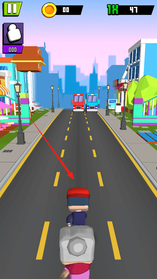 3、进入跑酷场景角色在道路上,通过滑动屏幕控制方向,避开车辆建筑这些障碍,一路往前跑收集金币完成跑酷挑战。
