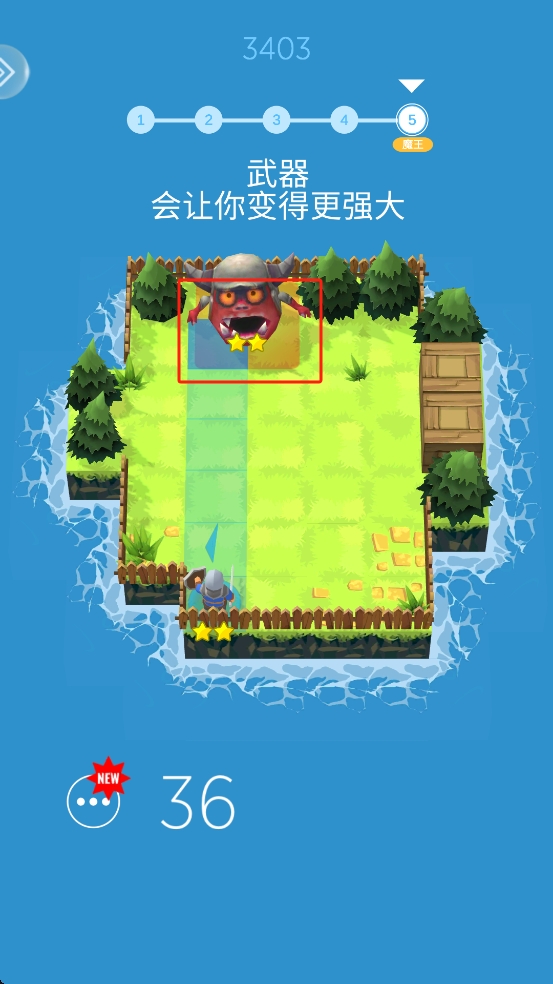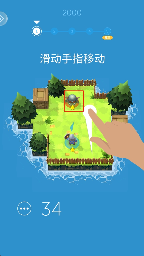 1、跟随指引滑动手指,控制蓝色骑士向红色敌人移动,攻击并收集星星,完成初始关卡目标,熟悉移动战斗机制。