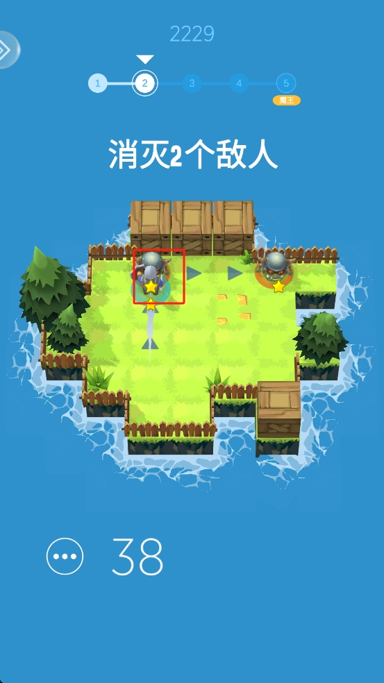 2、进入消灭2个敌人阶段,操控骑士击败左侧敌人,积累分数至2229,推进关卡进程,达成消灭数量要求。