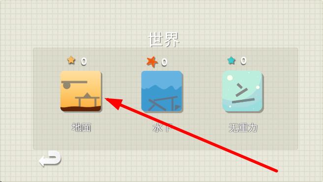 2、进入世界选择界面,按红色箭头指引,选择地面的世界,开启该场景的卡车解谜关卡。