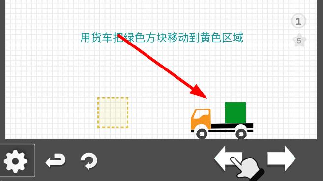 3、根据提示用货车把绿色方块移动到黄色区域,操控卡车,按箭头指向的左右按钮,移动绿色方块到目标区域,完成解谜。