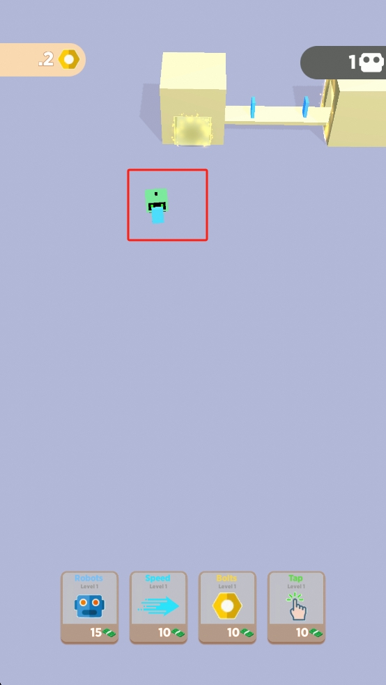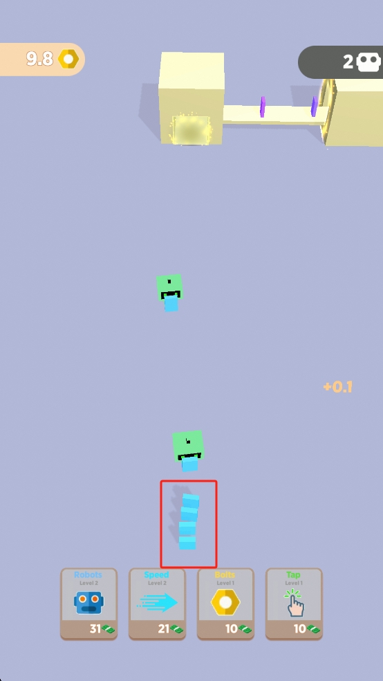 1、操控绿色角色,点击下方技能生成蓝色方块,规划移动路径,借助场景通道积累资源。