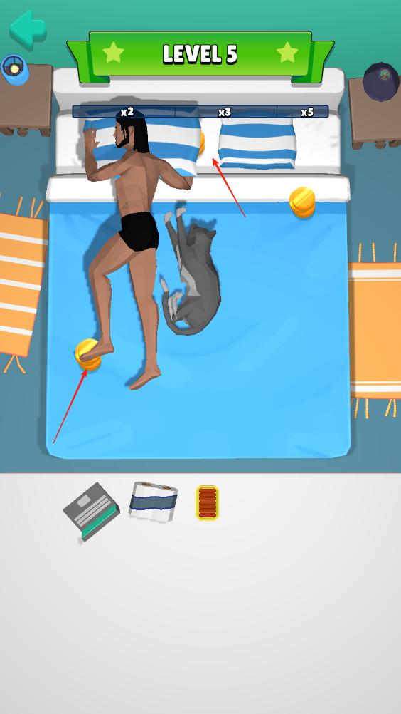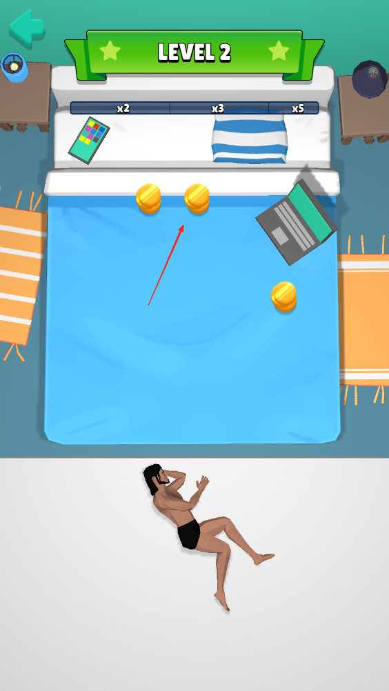 1、人物的睡姿是固定的,床铺上遍布着金币吗,我们需要将下面全部物体及人物摆上床且都触碰到这些金币。