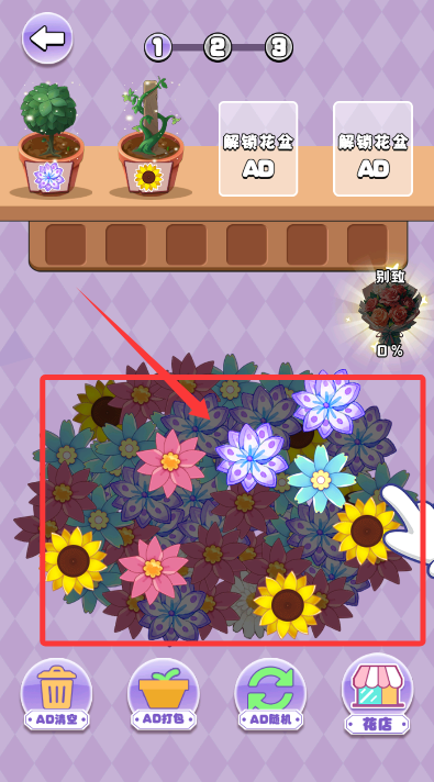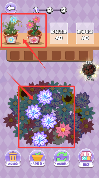 2、观察场中不同颜色的花朵,将相同颜色的花朵放到一个花盆中进行消除。