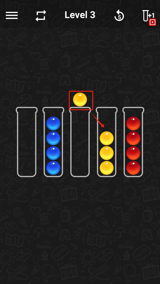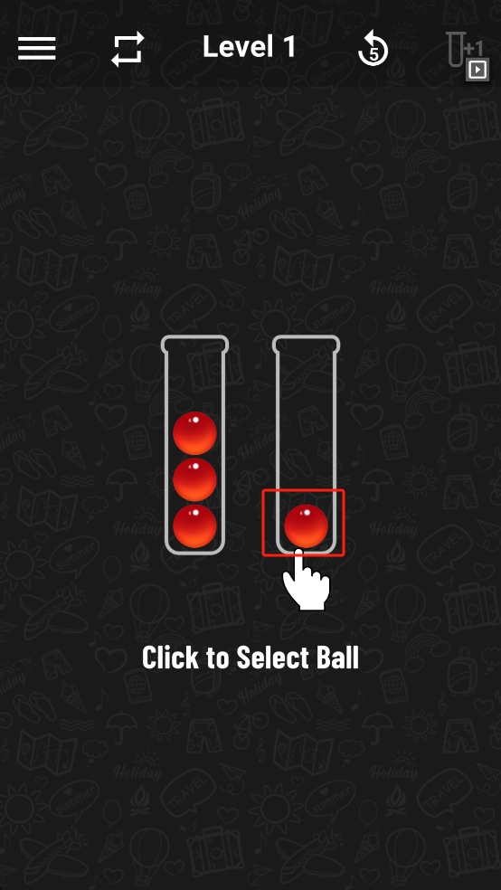 1、点击目标试管内的彩球,选中后移动至同色球所在试管,逐步归类同色球,完成Level1的红球整理任务。