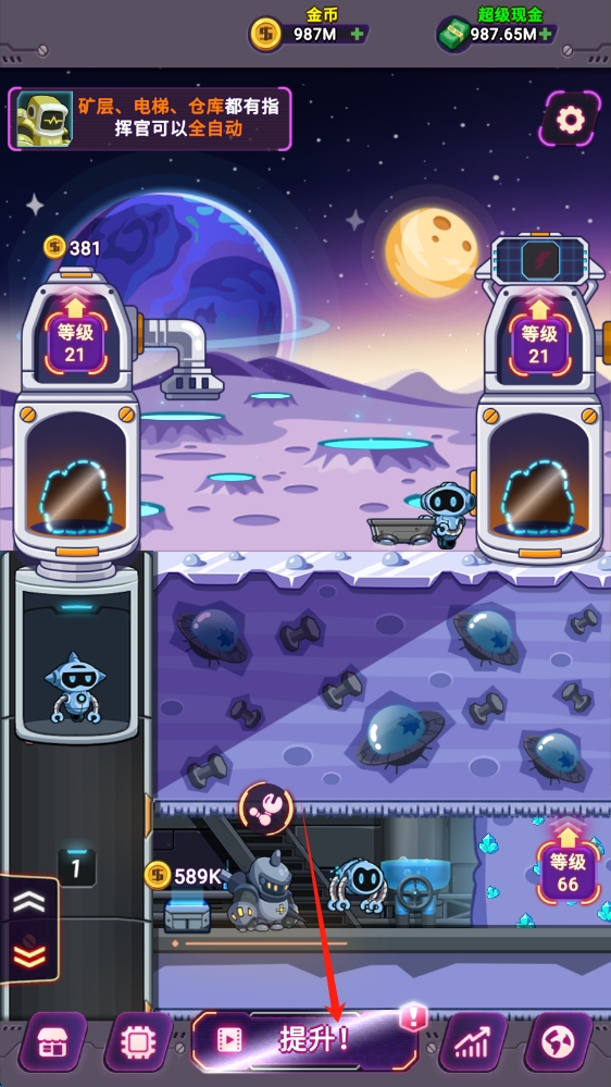 1、在游戏主界面,留意金币和超级现金数量,以及矿层、电梯等设施的等级情况。点击提升按钮,进入升级相关操作。