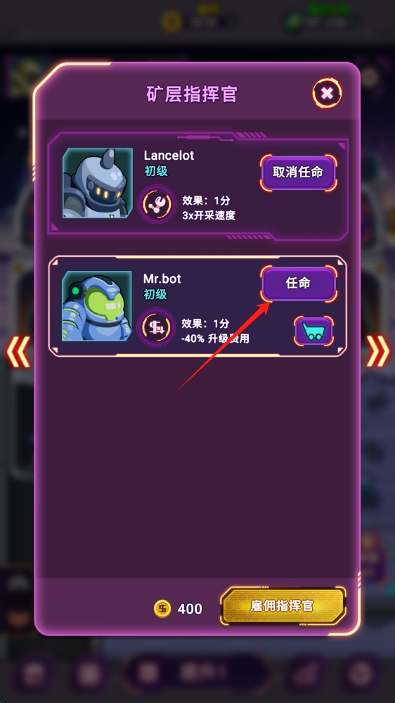 2、进入矿层指挥官任命界面后,查看不同指挥官的效果,根据需求进行选择。比如前期追求开采速度可以任命能提升开采速度的指挥官。