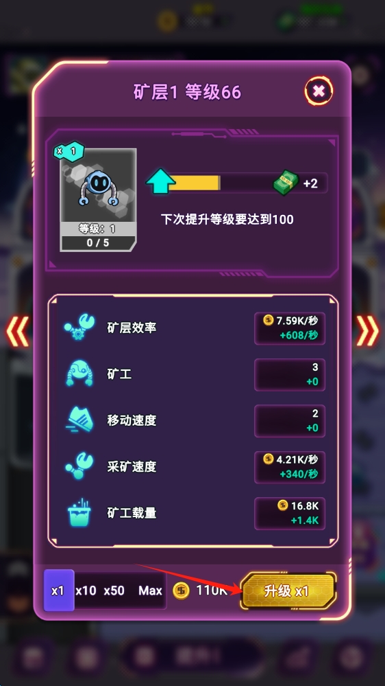 3、在矿层升级界面,了解矿层当前的等级、升级条件和各项属性。当资源满足升级需求时。