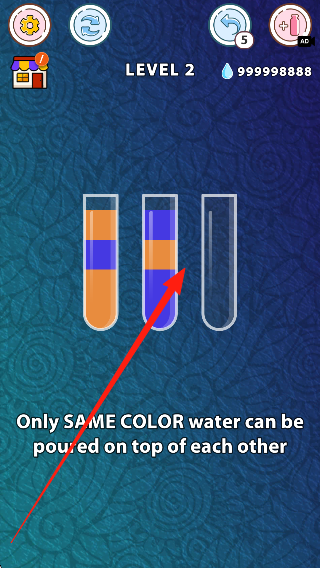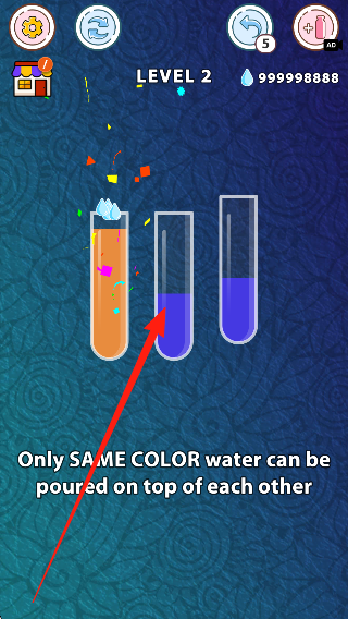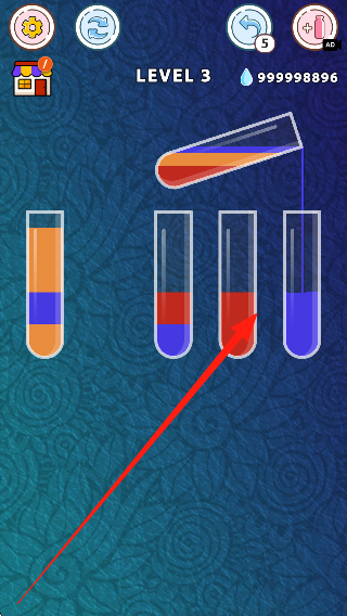 2、闯关过程中,将相同颜色的液体倒入同一容器,利用空容器灵活调配,逐步整理好所有液体。